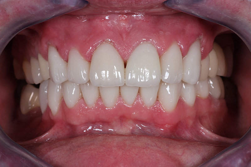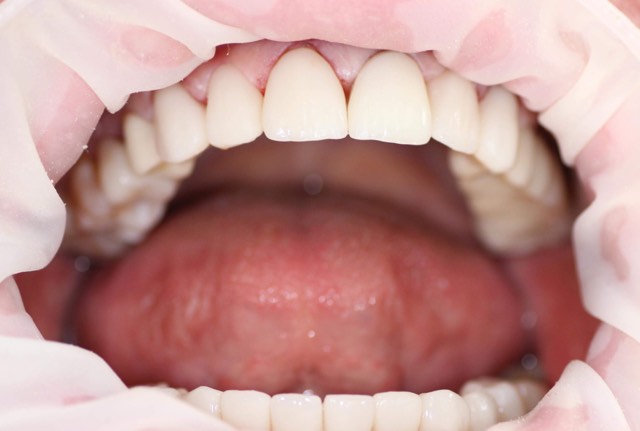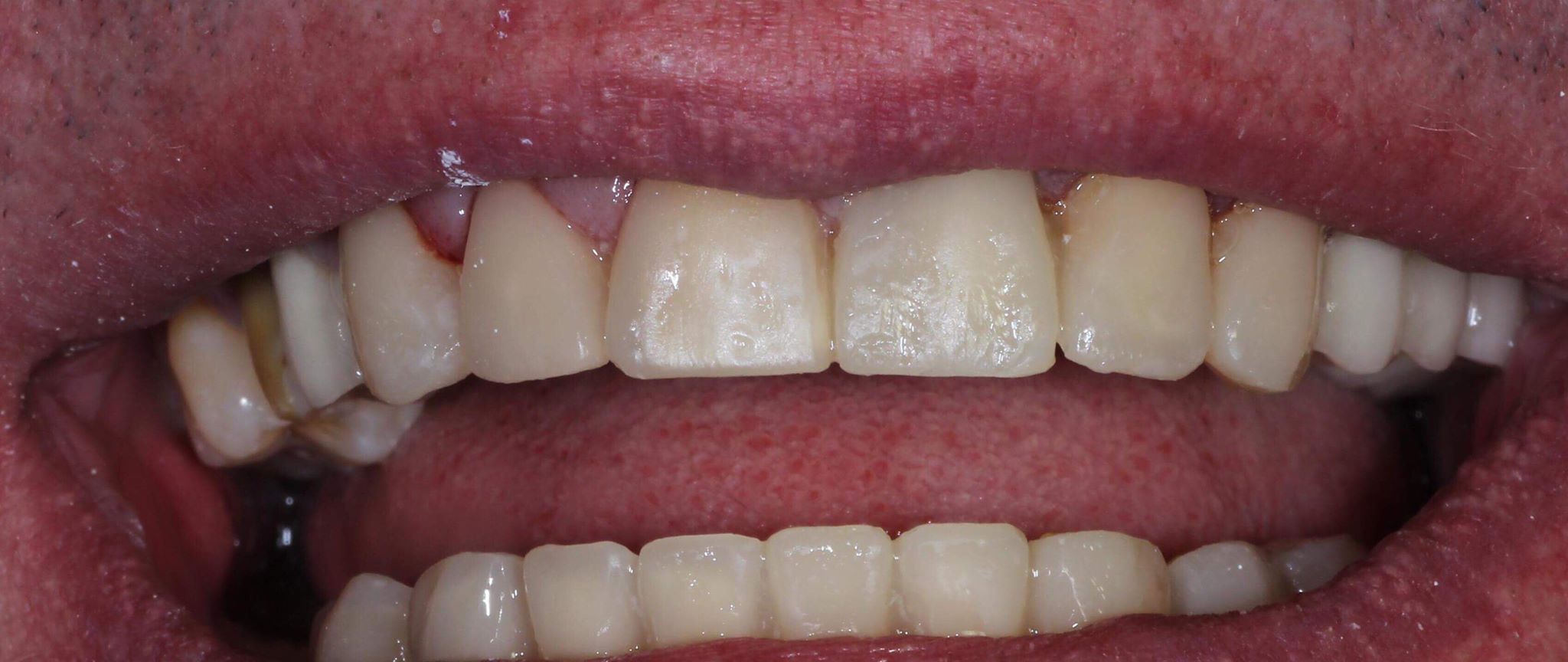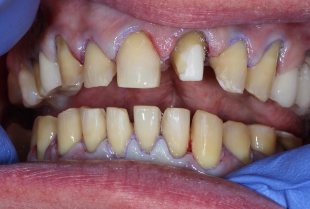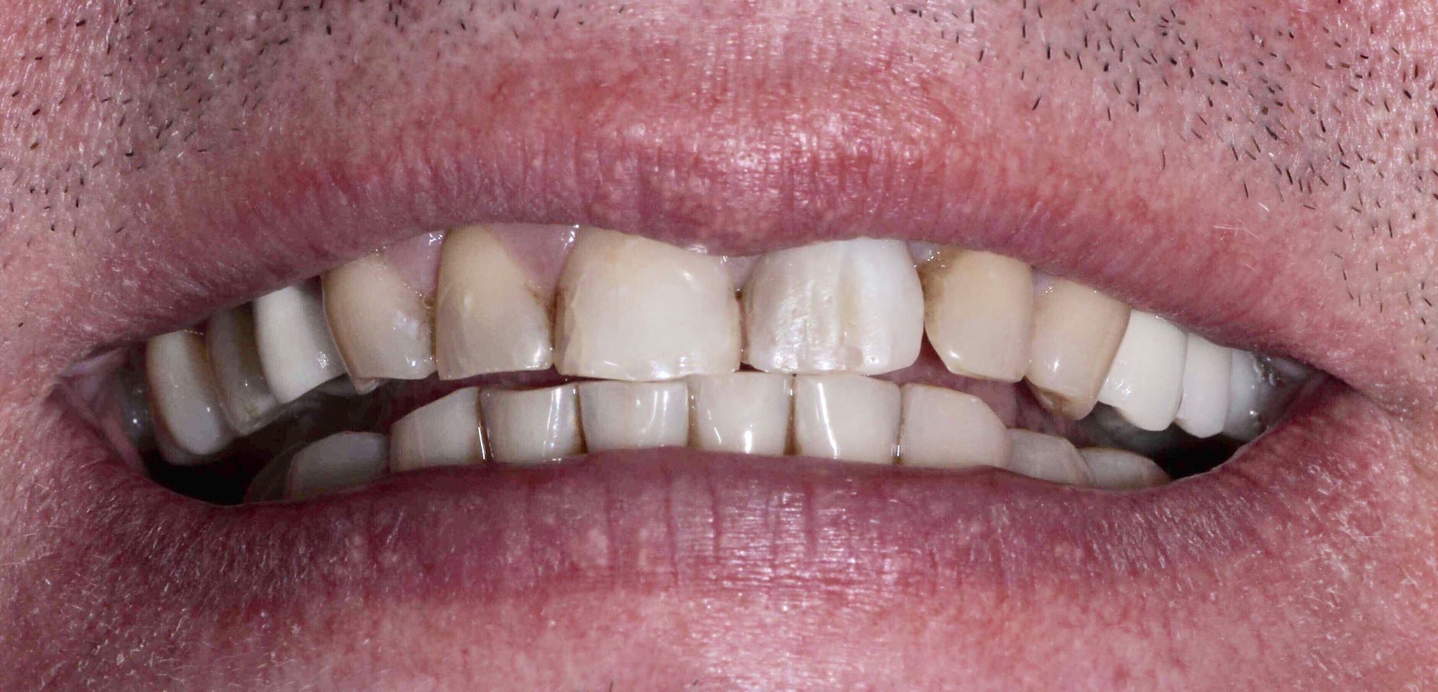 Полная реставрация зубного ряда, с применением коронок и виниров.