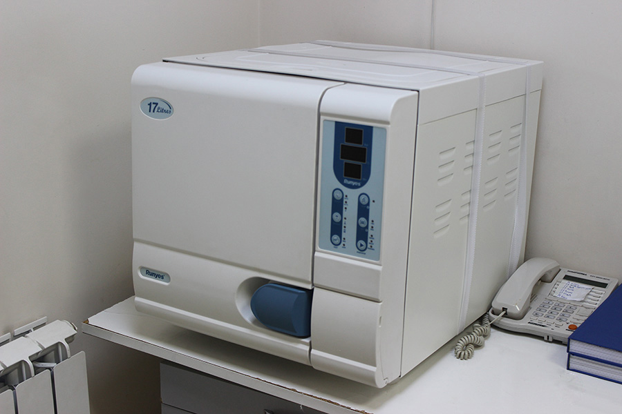 Итак, после лечения пациента, все использованные инструменты подвергаются физической обработке, медсестры моют специальной щеткой каждый инструмент, ополаскивая в проточной воде. После инструменты подвергаются химической обработке: помещаются в 1%-ый химический раствор Гексаниоз на 15 мин, после чего инструменты помещаются в другой химический раствор: 2%-ый Стераниоз на 1 час. Инструменты на которых есть кровь, до физической обработки опускаются в 3%-ый раствор перекиси водорода и лишь после этого проходят все остальные этапы стерилизации. Далее все инструменты сушатся и помещаются в стерильные пакеты, и начинается термический этап стерилизации. В Стом Лайн термическая стерилизация проводится в автоклаве фирмы Runyes, где инструменты проходят два этапа стерилизации: обрабатывается паром и в сухом режиме стерилизации.