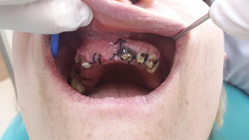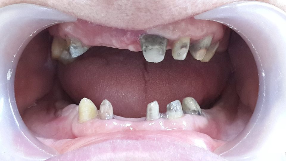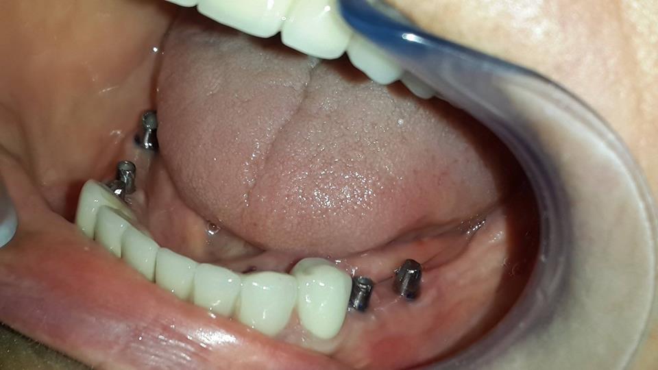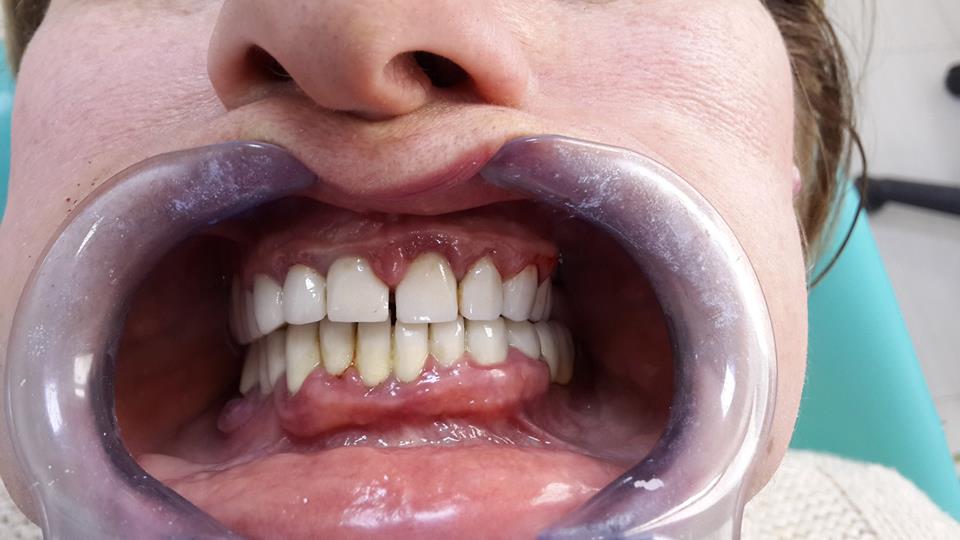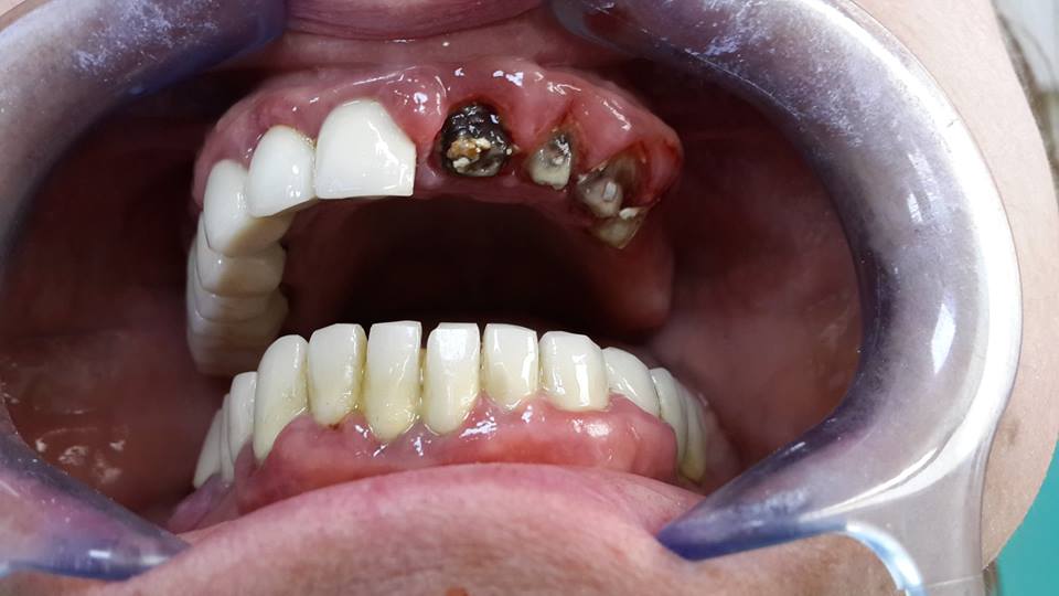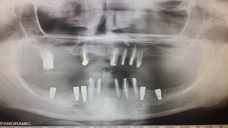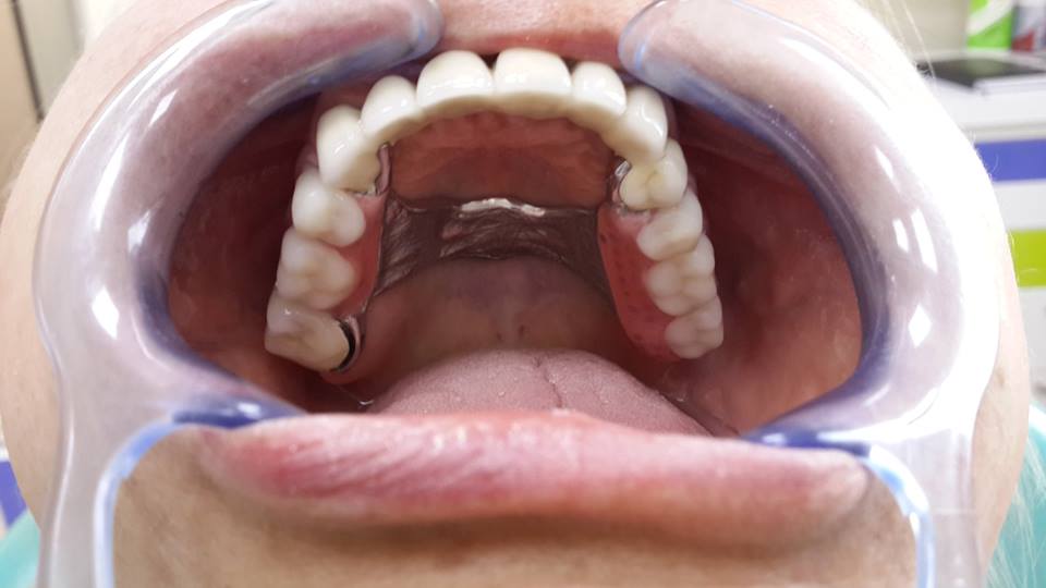 An example of complete rehabilitation of the oral cavity. Treatment included the removal of the old prosthesis, treatment of paradontitis, removal of a large cyst, implantation, clasp prosthesis.