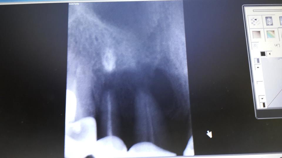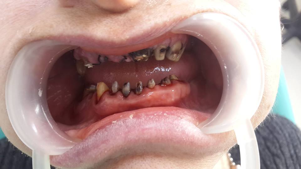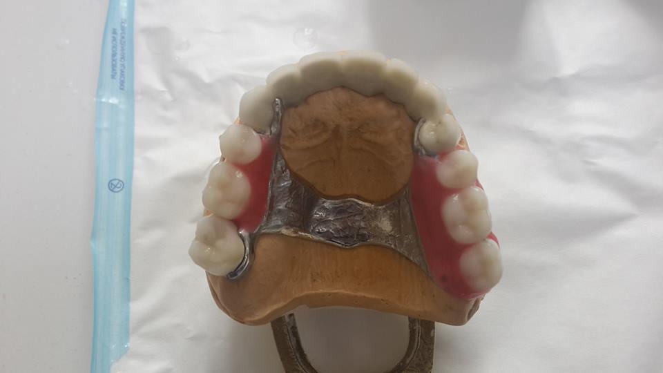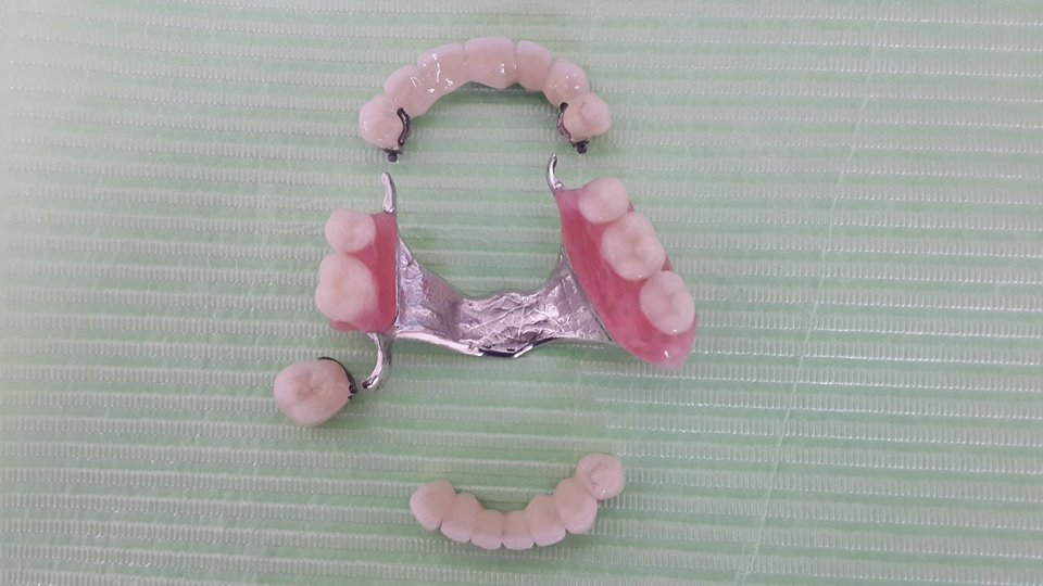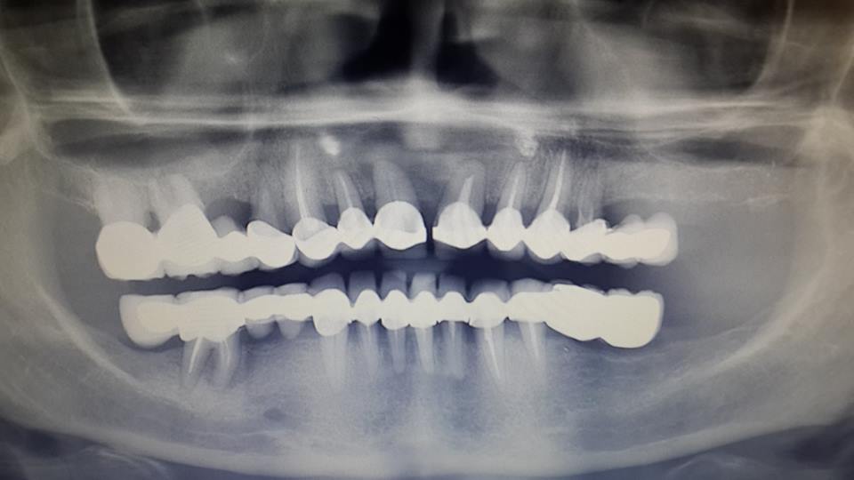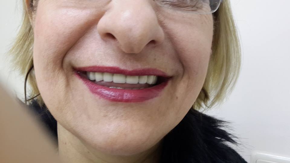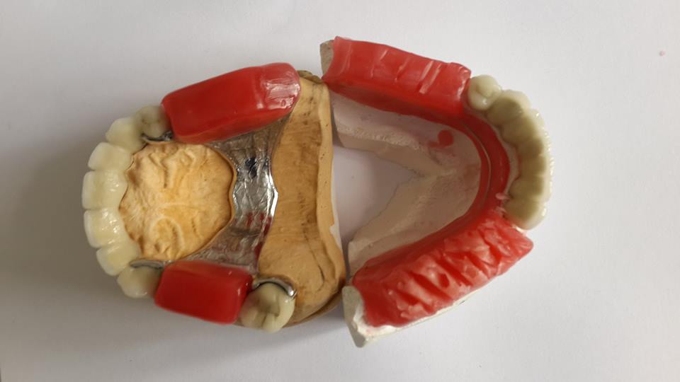 An example of complete rehabilitation of the oral cavity. Treatment included the removal of the old prosthesis, treatment of paradontitis, removal of a large cyst, implantation, clasp prosthesis.